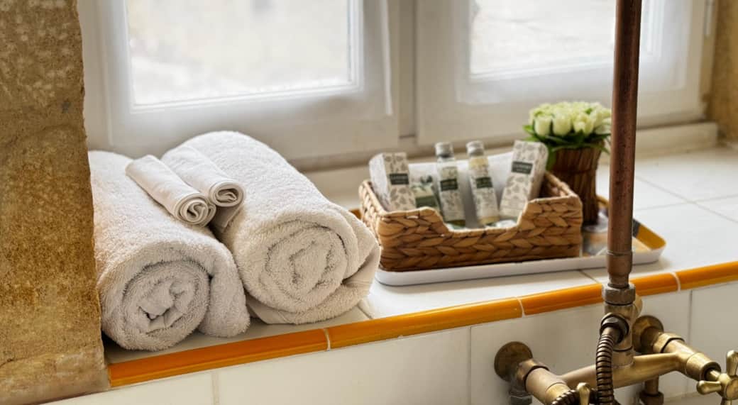 Bed linen, Hair dryer, Essentials, Shower, Towel set, Bathtub, Washbasin